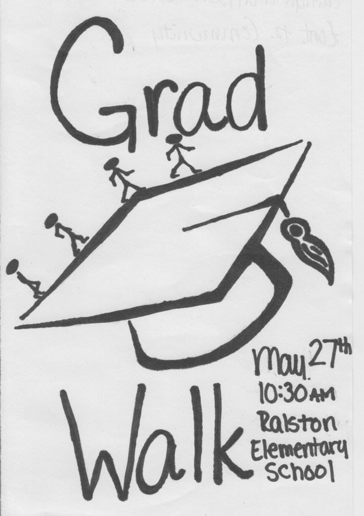 Considering the closeness of the Ralston community and the schooling system, I believe that a “Grad Walk” would enhance the quality of life in the community. The artifact I have created is a small flyer to advertise the walk, which happens May 27, 2016 at Ralston Elementary School. The Grad Walk would happen every year as latest high school seniors come close to graduating.