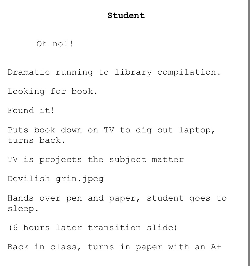 Day of the presentation the student starts feeling odd – they never realized it but they didn’t know many people in their class – they will be presenting in front of strangers