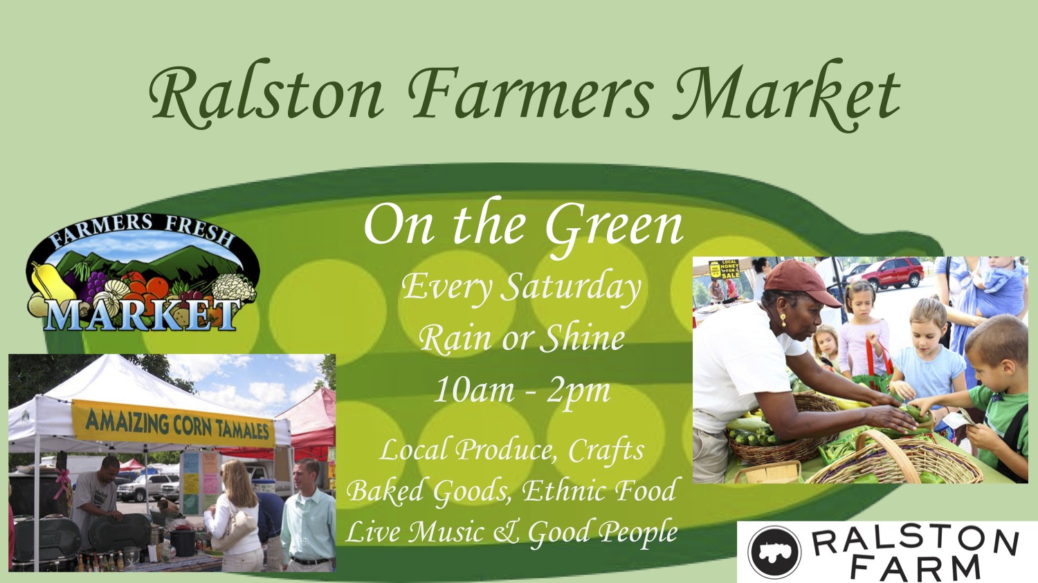 This journal entry is in reference to the Ralston Farmers Market poster design I made using “Google Slides.” I believe a small town community like Ralston would have a weekly farmers market during the summer months. The Ralston Green would be the perfect spot to host the market. The various ethnic groups that Ralston supports would be a great boon to the market as they would provide various products that support a wide range. I almost view this farmers market to be like a large potluck. On top of that, local farmers from the surrounding towns would be able to come in and sell their produce. Farmer’s markets seem to pop up everywhere. I think